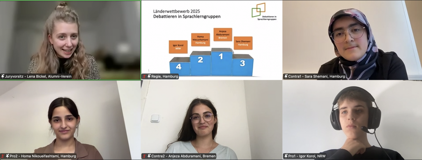 Für das Länderfinale hatten sich in den jeweiligen Bundesländern Anjeza Abduramani (Bremen), Igor Korol (NRW), Sara Shemani (Hamburg) und Homa Nikoueifashtami (Hamburg) qualifiziert. Die Debattantinnen und Debattanten setzten sich im Finale mit der Frage „Soll an allen Schulen an mindestens einem Tag in der Woche ausschließlich vegetarisches Essen ausgegeben werden?“ auseinander. Inhaltlich wurden in der Debatte viele Fragen aufgeworfen, die sich im Kontext der Debattenfrage stellen: Setzt die Maßnahme ein wirksames Zeichen gegen das Tierleid? Hilft die Maßnahme dem Umweltschutz? Ist es sinnvoll, Schülerinnen und Schülern vorzuschreiben, was sie essen sollen? Die Jurorinnen und Juroren zeigten sich sehr beeindruckt vom Sachwissen der Debattantinnen und Debattanten. So hob Lena Bickel als Juryvorsitzende in der Rückmeldung hervor, dass die Frage nur auf den ersten Blick einfach erscheine, aber doch viele Fragen aufwerfe. Darüber hinaus beeindruckte die Ausdrucksfähigkeit der Teilnehmenden. Schließlich nehmen an diesem Wettbewerb ausschließlich Lernende teil, deren Muttersprache nicht Deutsch ist und die darüber hinaus erst seit relativ kurzer die deutsche Sprache erlernen. Am Ende war die Bewertung der Jury dementsprechend eng. Besonders überzeugt war die Jury von Anjeza Abduramanis engagierter Leistung, so dass sie den diesjährigen Wettbewerb gewonnen hat.  Auch Homa Nikoueifashtamis darf sich als Zweitplatzierte besonders freuen. Die beiden Erstplatzierten bekamen als Preis eine Einladung zu den Bundesfinaltagen „Jugend debattiert“ in Berlin im kommenden Juni. Dies wurde freundlicherweise durch die Hertie-Stiftung ermöglicht und bietet eine tolle Möglichkeit der Verbindung der beiden Wettbewerbe. Die Idee der Integration der Sprachlernenden in das Projekt „Jugend debattiert“ wird auf großartige Art und Weise auch von dem Alumni-Verein von „Jugend debattiert“ gestärkt, indem Lena Bickel als Vorsitzende des Vereins eine Einladung für die Mitgliedschaft im Alumni-Verein aussprach.