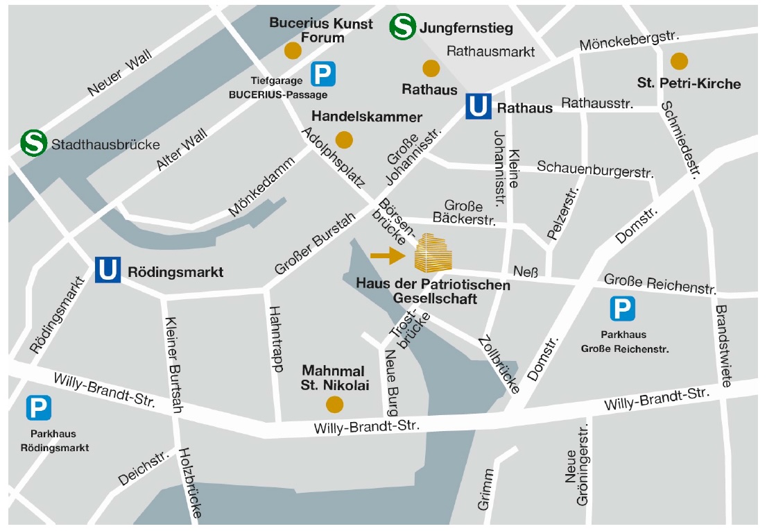 Bus und Bahn: Am einfachsten erreichen Sie das Hamburger Rathaus / das Saalhaus mit öffentlichen Verkehrsmitteln. Die Haltestellen Rathausmarkt und Jungfernstieg befinden sich in unmittelbarer Nähe, dort fahren U-Bahn, S-Bahn und zahlreiche Buslinien. Um Ihre Anreise zu planen, nutzen Sie eine Navigationsapp, wie Geo-Online, Google Maps oder hvv switch oder die aktuelle Fahrplanauskunft des hvv, dort finden Sie auch Informationen zur barrierefreien Anreise.