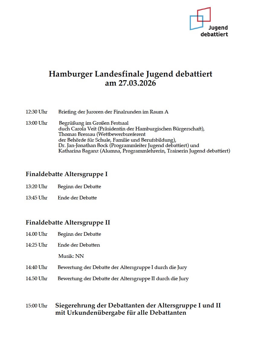 Nachdem rund 18.000 Schülerinnen und Schüler aus 84 Hamburger Schulen bei den Vorentscheiden zu „Jugend debattiert“ mitgemacht haben, treten nun die 48 besten von ihnen in den beiden Vorrunden des Landeswettbewerbs am 27.03.2026 an.