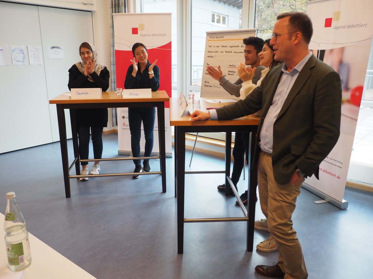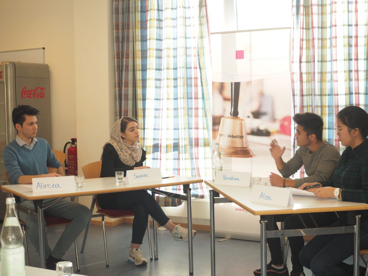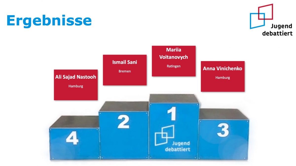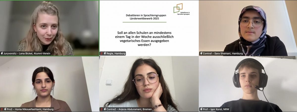 Für das Länderfinale hatten sich in den jeweiligen Bundesländern Anjeza Abduramani (Bremen), Igor Korol (NRW), Sara Shemani (Hamburg) und Homa Nikoueifashtami (Hamburg) qualifiziert. Die Debattantinnen und Debattanten setzten sich im Finale mit der Frage „Soll an allen Schulen an mindestens einem Tag in der Woche ausschließlich vegetarisches Essen ausgegeben werden?“ auseinander. Inhaltlich wurden in der Debatte viele Fragen aufgeworfen, die sich im Kontext der Debattenfrage stellen: Setzt die Maßnahme ein wirksames Zeichen gegen das Tierleid? Hilft die Maßnahme dem Umweltschutz? Ist es sinnvoll, Schülerinnen und Schülern vorzuschreiben, was sie essen sollen? Die Jurorinnen und Juroren zeigten sich sehr beeindruckt vom Sachwissen der Debattantinnen und Debattanten. So hob Lena Bickel als Juryvorsitzende in der Rückmeldung hervor, dass die Frage nur auf den ersten Blick einfach erscheine, aber doch viele Fragen aufwerfe. Darüber hinaus beeindruckte die Ausdrucksfähigkeit der Teilnehmenden. Schließlich nehmen an diesem Wettbewerb ausschließlich Lernende teil, deren Muttersprache nicht Deutsch ist und die darüber hinaus erst seit relativ kurzer die deutsche Sprache erlernen. Am Ende war die Bewertung der Jury dementsprechend eng. Besonders überzeugt war die Jury von Anjeza Abduramanis engagierter Leistung, so dass sie den diesjährigen Wettbewerb gewonnen hat. Auch Homa Nikoueifashtamis darf sich als Zweitplatzierte besonders freuen. Die beiden Erstplatzierten bekamen als Preis eine Einladung zu den Bundesfinaltagen „Jugend debattiert“ in Berlin im kommenden Juni. Dies wurde freundlicherweise durch die Hertie-Stiftung ermöglicht und bietet eine tolle Möglichkeit der Verbindung der beiden Wettbewerbe. Die Idee der Integration der Sprachlernenden in das Projekt „Jugend debattiert“ wird auf großartige Art und Weise auch von dem Alumni-Verein von „Jugend debattiert“ gestärkt, indem Lena Bickel als Vorsitzende des Vereins eine Einladung für die Mitgliedschaft im Alumni-Verein aussprach.