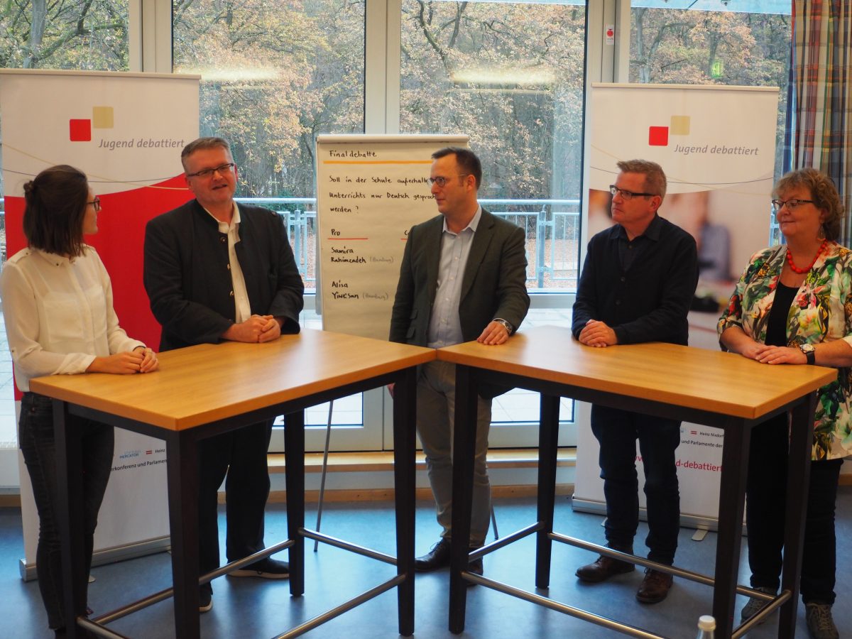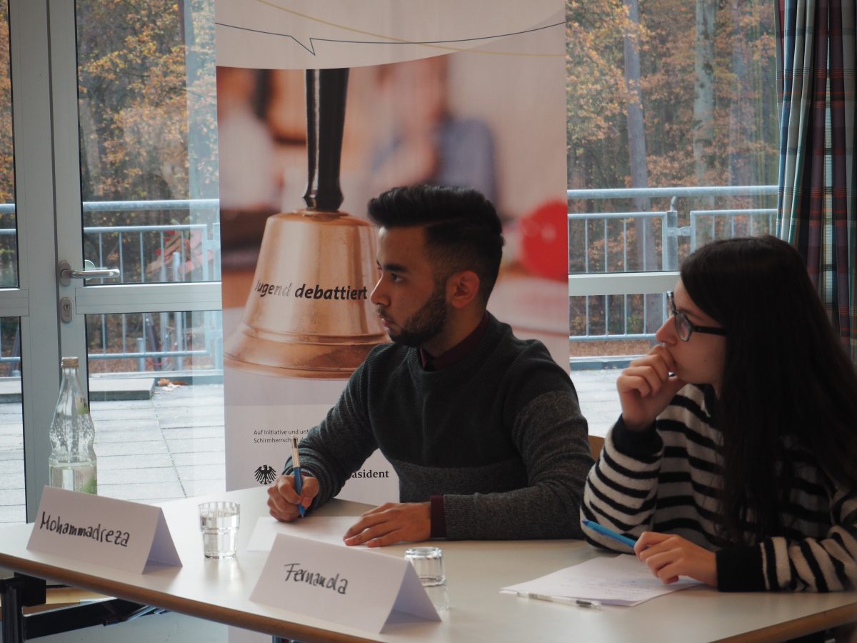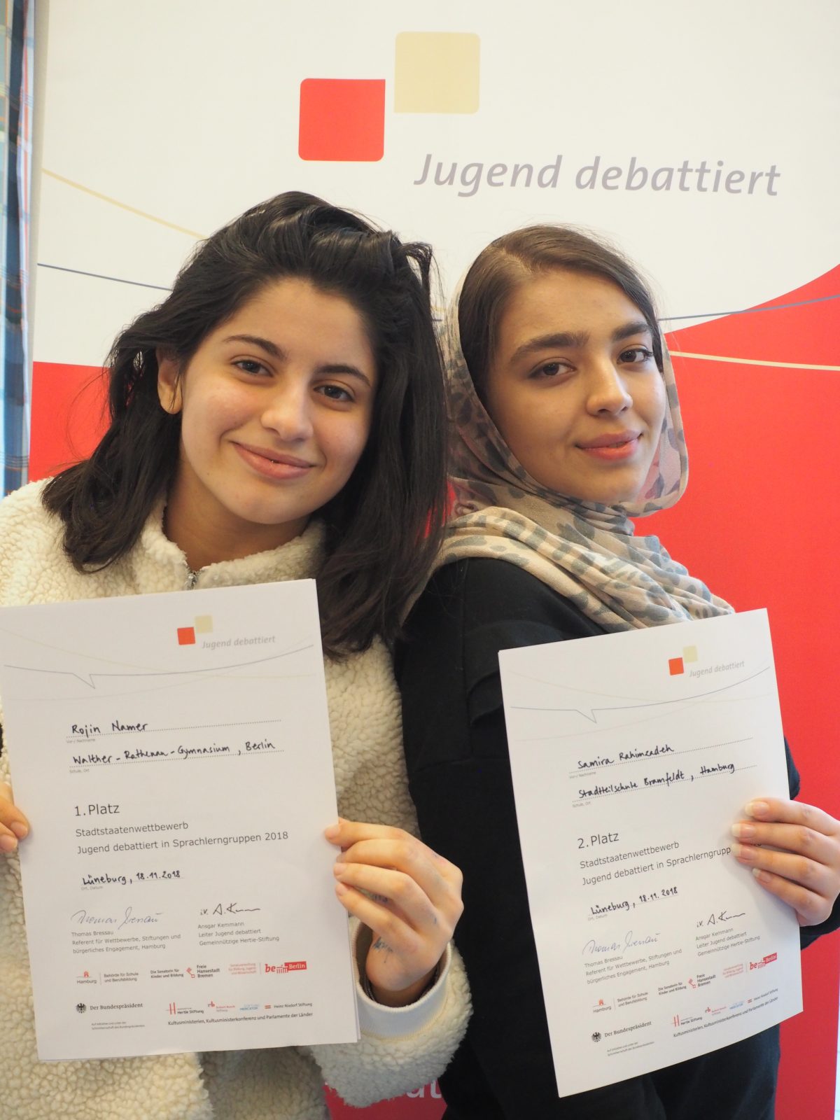 Für das Länderfinale hatten sich in den jeweiligen Bundesländern Anjeza Abduramani (Bremen), Igor Korol (NRW), Sara Shemani (Hamburg) und Homa Nikoueifashtami (Hamburg) qualifiziert. Die Debattantinnen und Debattanten setzten sich im Finale mit der Frage „Soll an allen Schulen an mindestens einem Tag in der Woche ausschließlich vegetarisches Essen ausgegeben werden?“ auseinander. Inhaltlich wurden in der Debatte viele Fragen aufgeworfen, die sich im Kontext der Debattenfrage stellen: Setzt die Maßnahme ein wirksames Zeichen gegen das Tierleid? Hilft die Maßnahme dem Umweltschutz? Ist es sinnvoll, Schülerinnen und Schülern vorzuschreiben, was sie essen sollen? Die Jurorinnen und Juroren zeigten sich sehr beeindruckt vom Sachwissen der Debattantinnen und Debattanten. So hob Lena Bickel als Juryvorsitzende in der Rückmeldung hervor, dass die Frage nur auf den ersten Blick einfach erscheine, aber doch viele Fragen aufwerfe. Darüber hinaus beeindruckte die Ausdrucksfähigkeit der Teilnehmenden. Schließlich nehmen an diesem Wettbewerb ausschließlich Lernende teil, deren Muttersprache nicht Deutsch ist und die darüber hinaus erst seit relativ kurzer die deutsche Sprache erlernen. Am Ende war die Bewertung der Jury dementsprechend eng. Besonders überzeugt war die Jury von Anjeza Abduramanis engagierter Leistung, so dass sie den diesjährigen Wettbewerb gewonnen hat. Auch Homa Nikoueifashtamis darf sich als Zweitplatzierte besonders freuen. Die beiden Erstplatzierten bekamen als Preis eine Einladung zu den Bundesfinaltagen „Jugend debattiert“ in Berlin im kommenden Juni. Dies wurde freundlicherweise durch die Hertie-Stiftung ermöglicht und bietet eine tolle Möglichkeit der Verbindung der beiden Wettbewerbe. Die Idee der Integration der Sprachlernenden in das Projekt „Jugend debattiert“ wird auf großartige Art und Weise auch von dem Alumni-Verein von „Jugend debattiert“ gestärkt, indem Lena Bickel als Vorsitzende des Vereins eine Einladung für die Mitgliedschaft im Alumni-Verein aussprach.