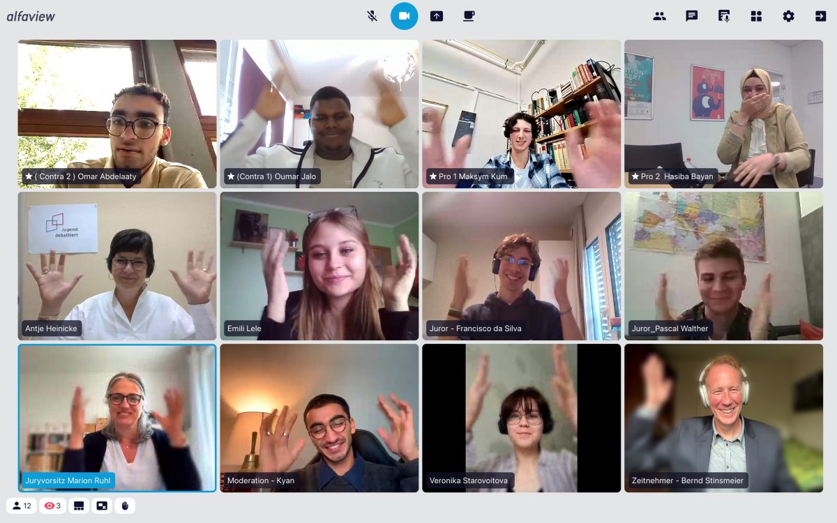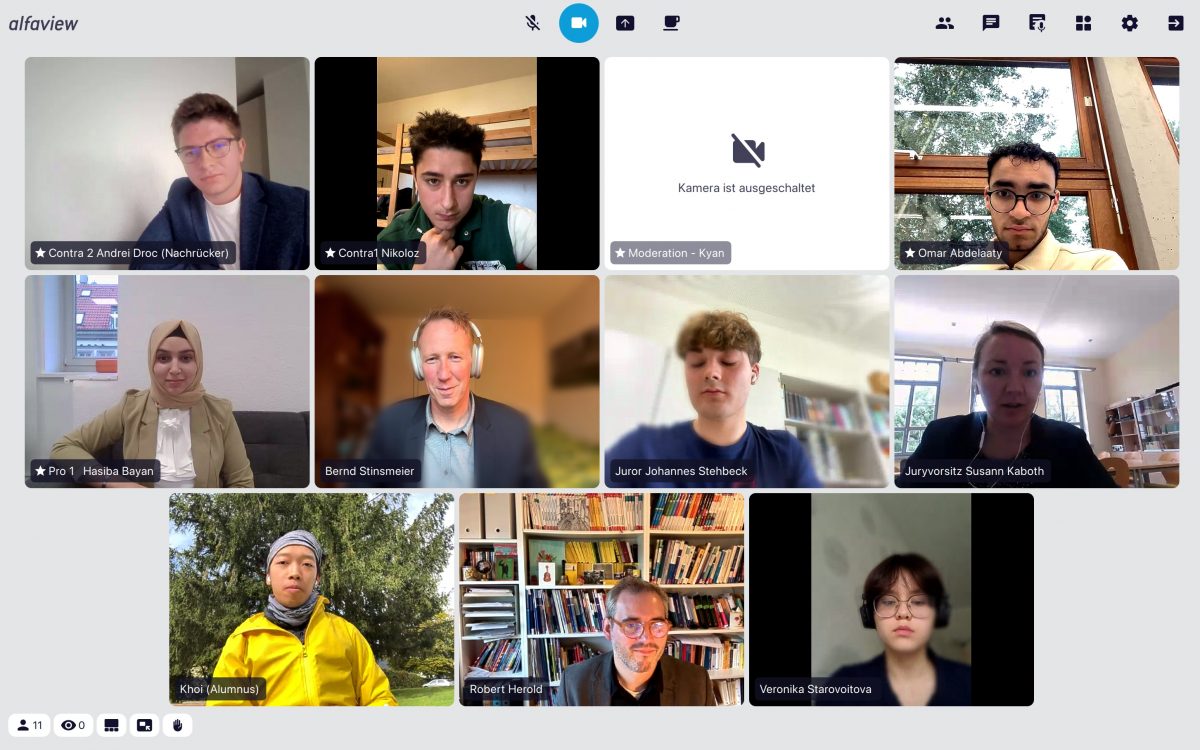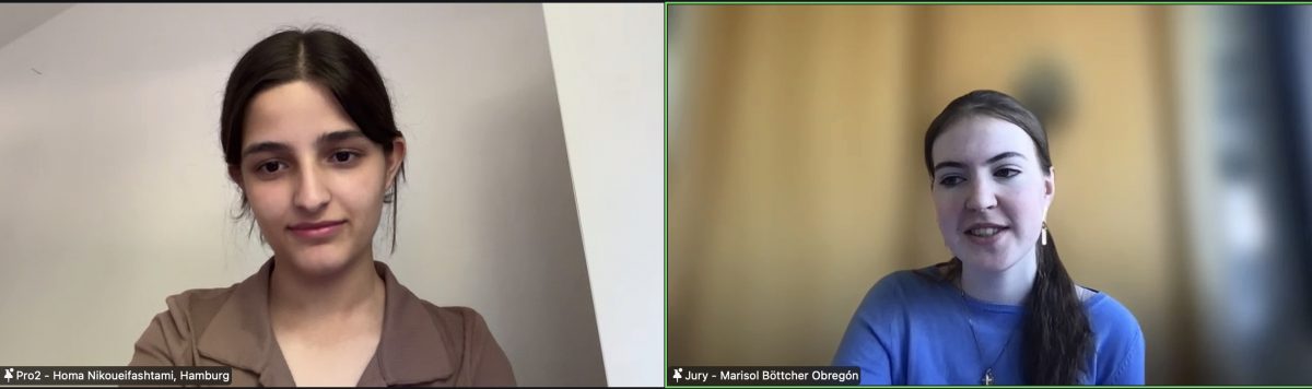 Dem Alumni-Verein ist insgesamt für die großartige Unterstützung des Wettbewerbs „Debattieren in Sprachlerngruppen“ zu danken, da auch in diesem Jahr mit Lena Bickel, Jonathan Schackert und Nico Bosler drei Alumni in der Jury den Wettbewerb unterstützt haben. Mit Marisol Böttcher, zugeschaltet aus Madrid, ergänzte noch eine Alumna aus dem Wettbewerb „Jugend debattiert international“ die Jury. Komplettiert wurde die Jury durch Hasiba Bayan, die Vorjahressiegerin des Wettbewerbs „Debattieren in Sprachlerngruppen“. Ihre Expertise und ihr Einfühlungsvermögen als ehemalige Teilnehmende trugen wesentlich zur professionellen aber auch angenehmen Atmosphäre bei.
