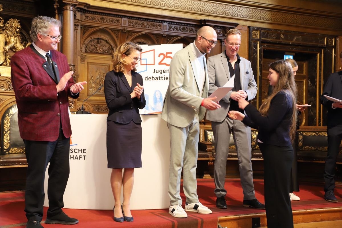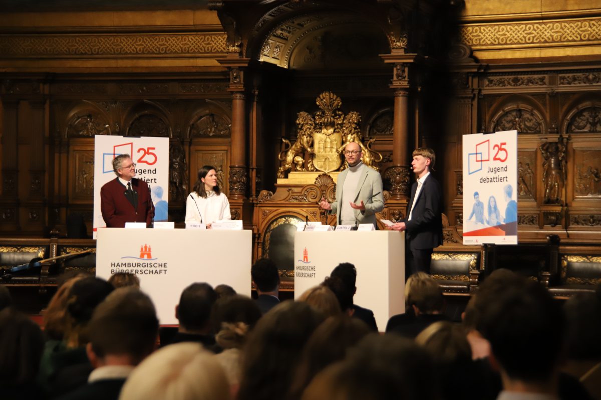 Carola Veit – Präsidentin der Hamburgischen Bürgerschaft, Thomas Bressau – Wettbewerbsreferent der BSFB, Dr. Jan-Jonathan Bock – Projektleiter von Jugend Debattiert, sowie Fraktionsvertreter:innen der Parteien der Bürgerschaft und unsere Medienpartner vom NDR, Hamburger Abendblatt und TIDE begleiteten den Landeswettbewerb als Juror:innen und Gäste der Talkrunde.