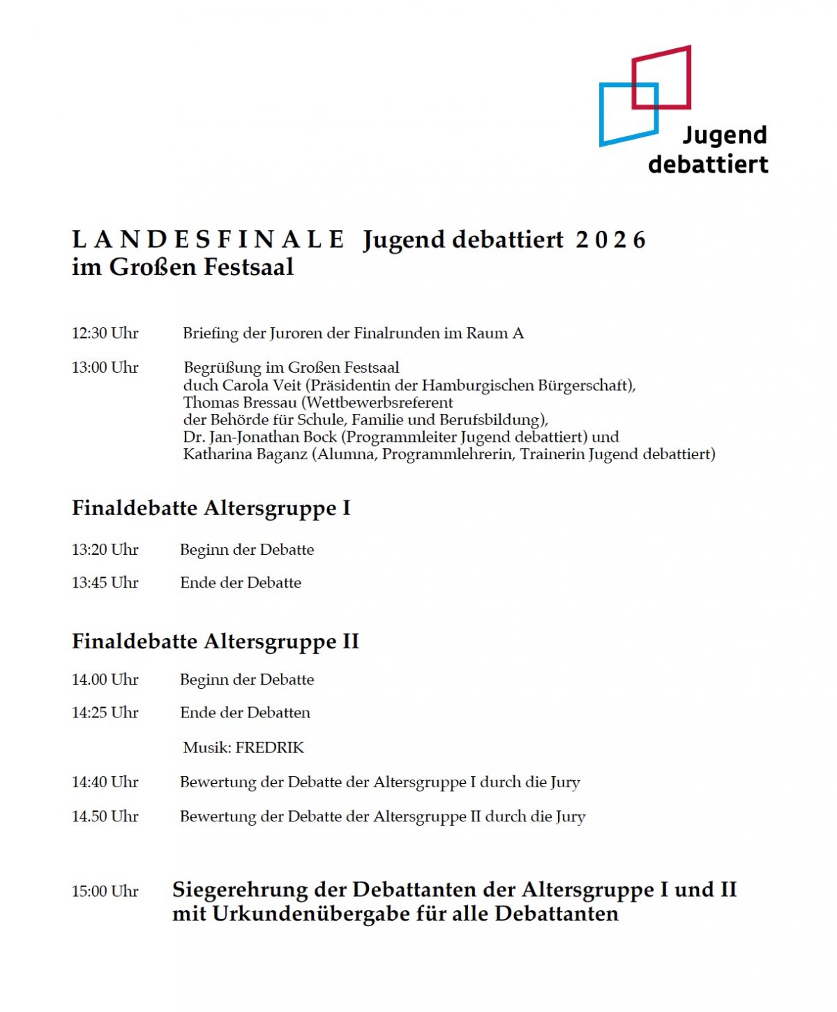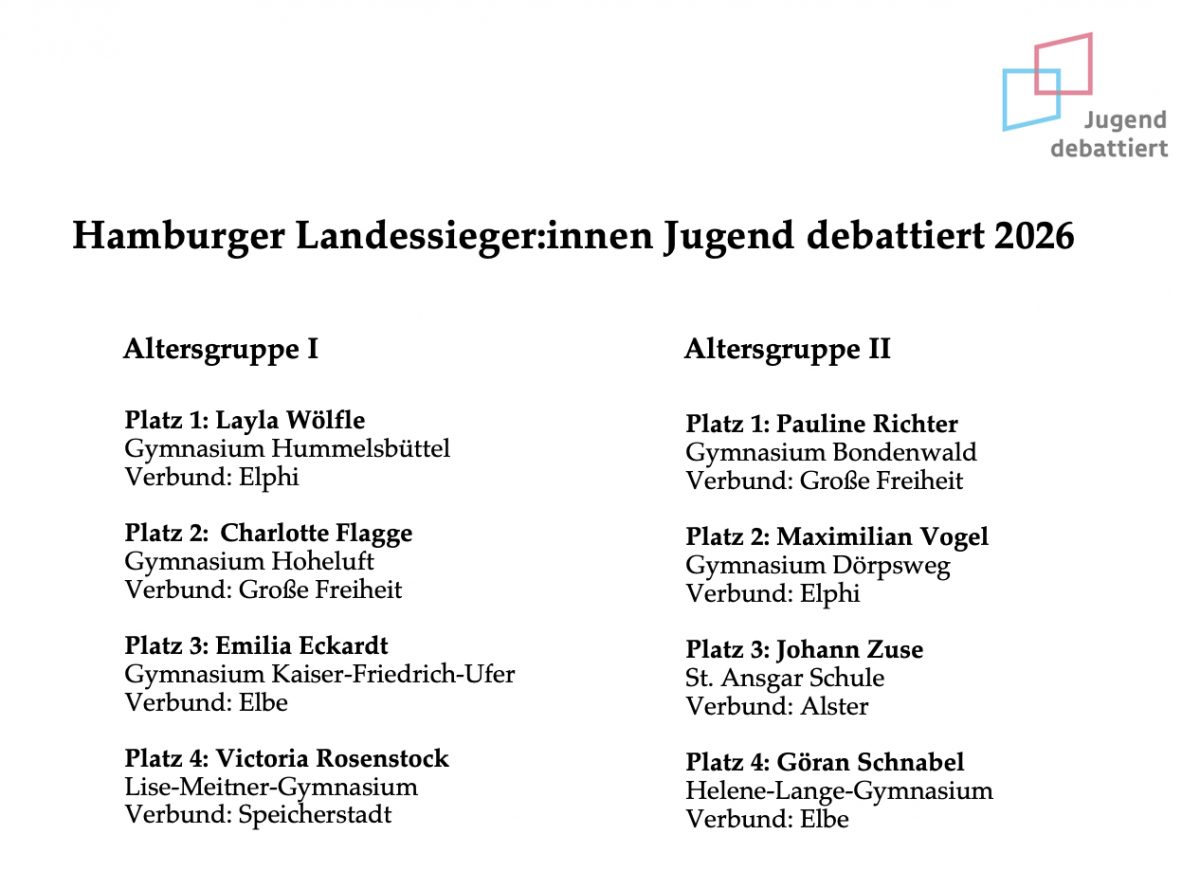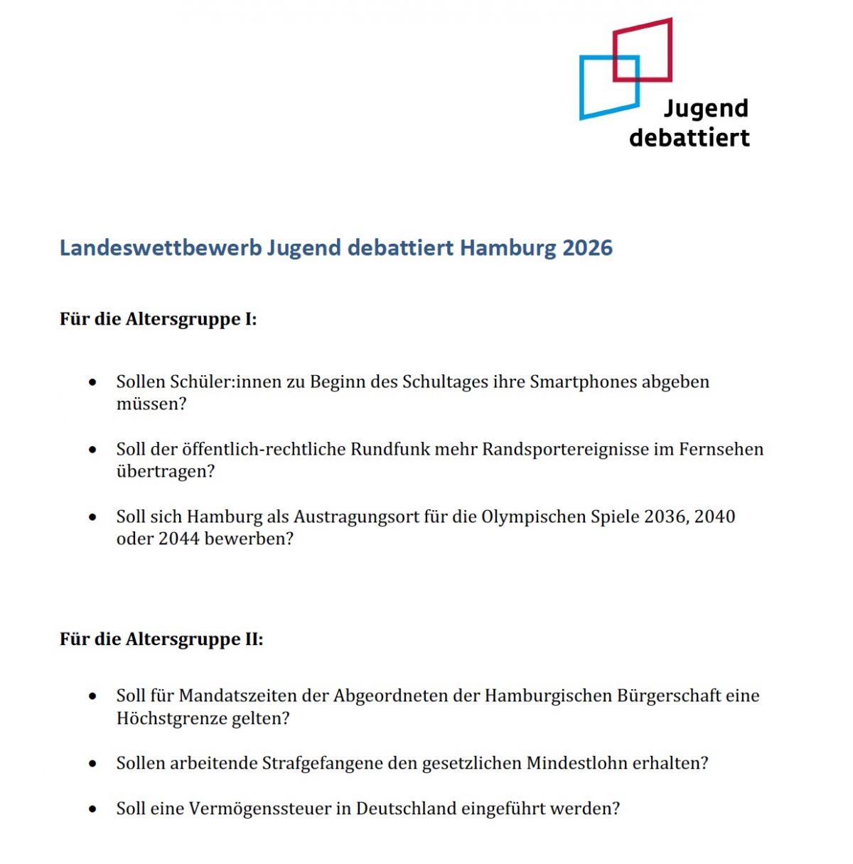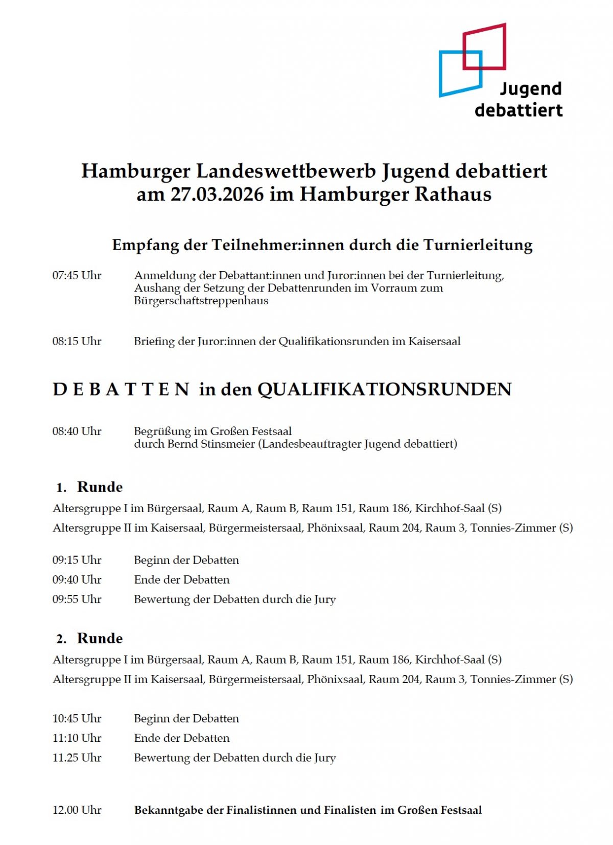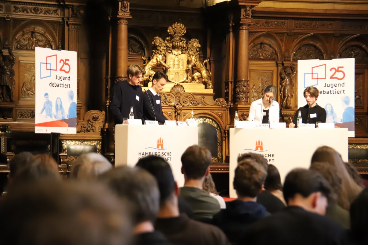 Nachdem rund 20.000 Schülerinnen und Schüler aus 87 Hamburger Schulen bei den Vorentscheiden zu „Jugend debattiert“ mitgemacht haben, traten nun die 48 besten von ihnen in den beiden Vorrunden des Landeswettbewerbs am 27.03.2026 an.