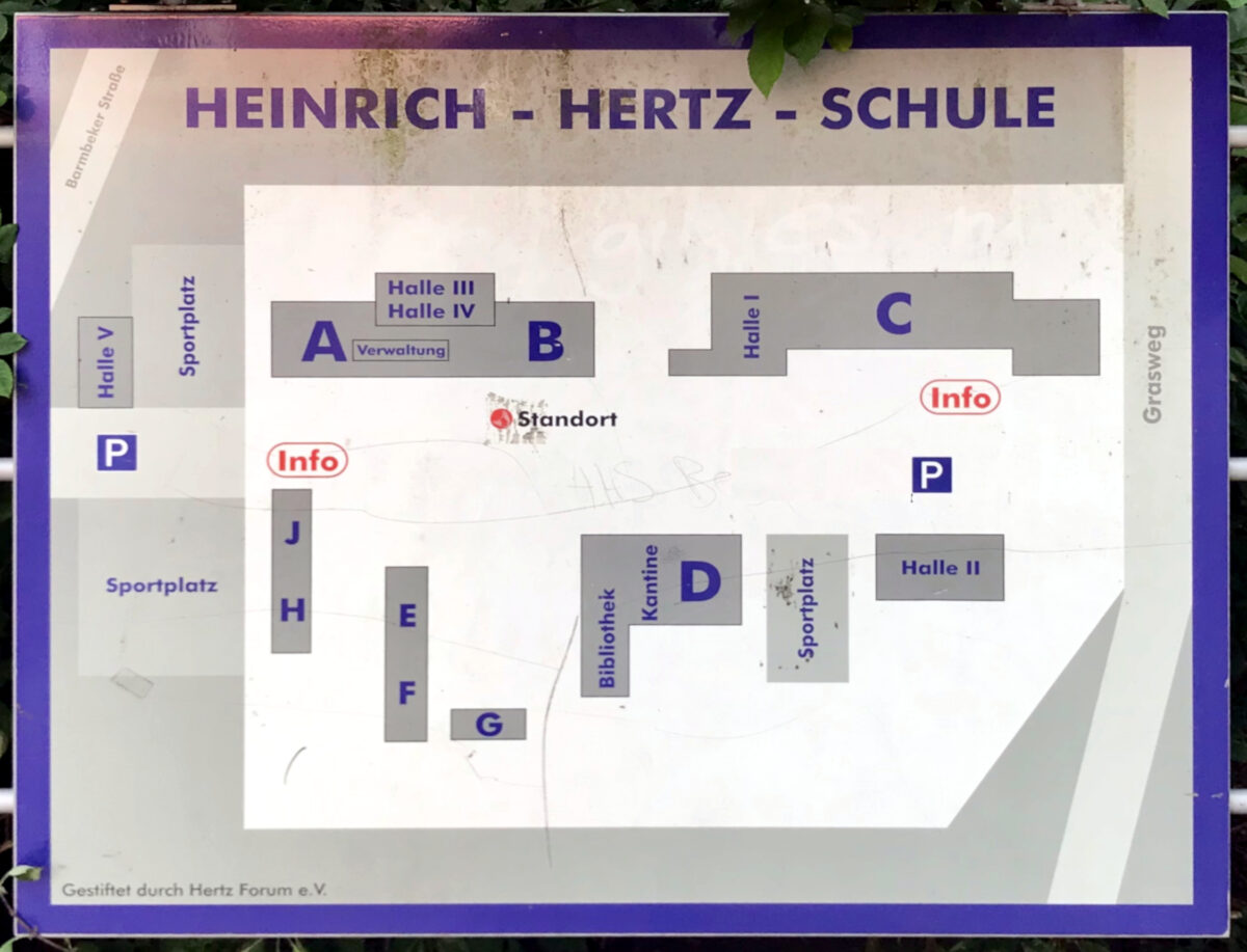 Wegbeschreibung: Von der Haltestelle U Borgweg aus über den Grasweg das Schulgelände betreten. Dort dann zur Aula im 1. Stock von Haus C (siehe Lageplan) kommen.