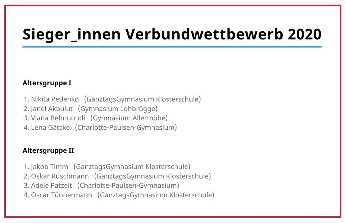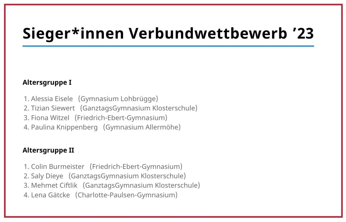 Nach insgesamt fünf Verbundwettbewerben am Charlotte-Paulsen-Gymnasium findet der Wettbewerb in unserem Verbund in diesem Schuljahr erstmalig am Friedrich-Ebert-Gymnasium statt.