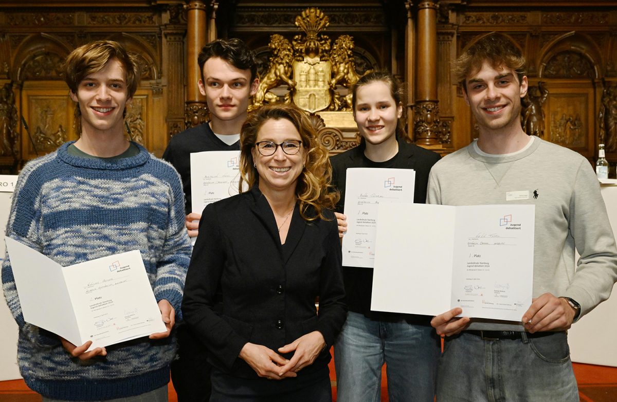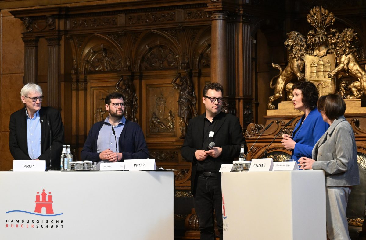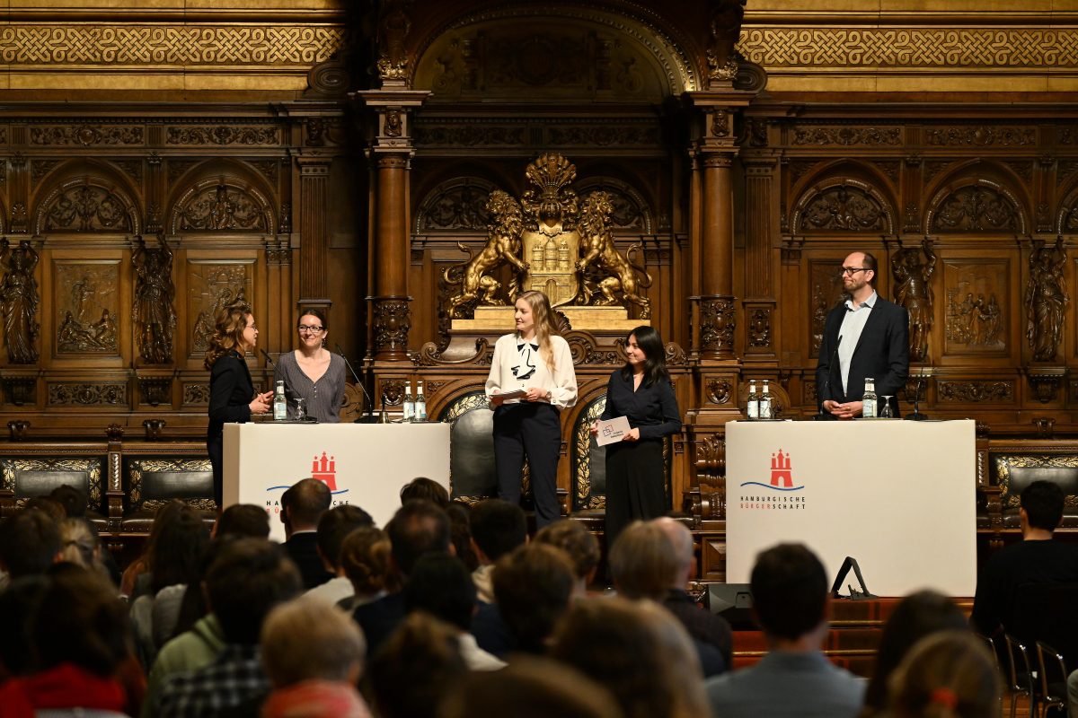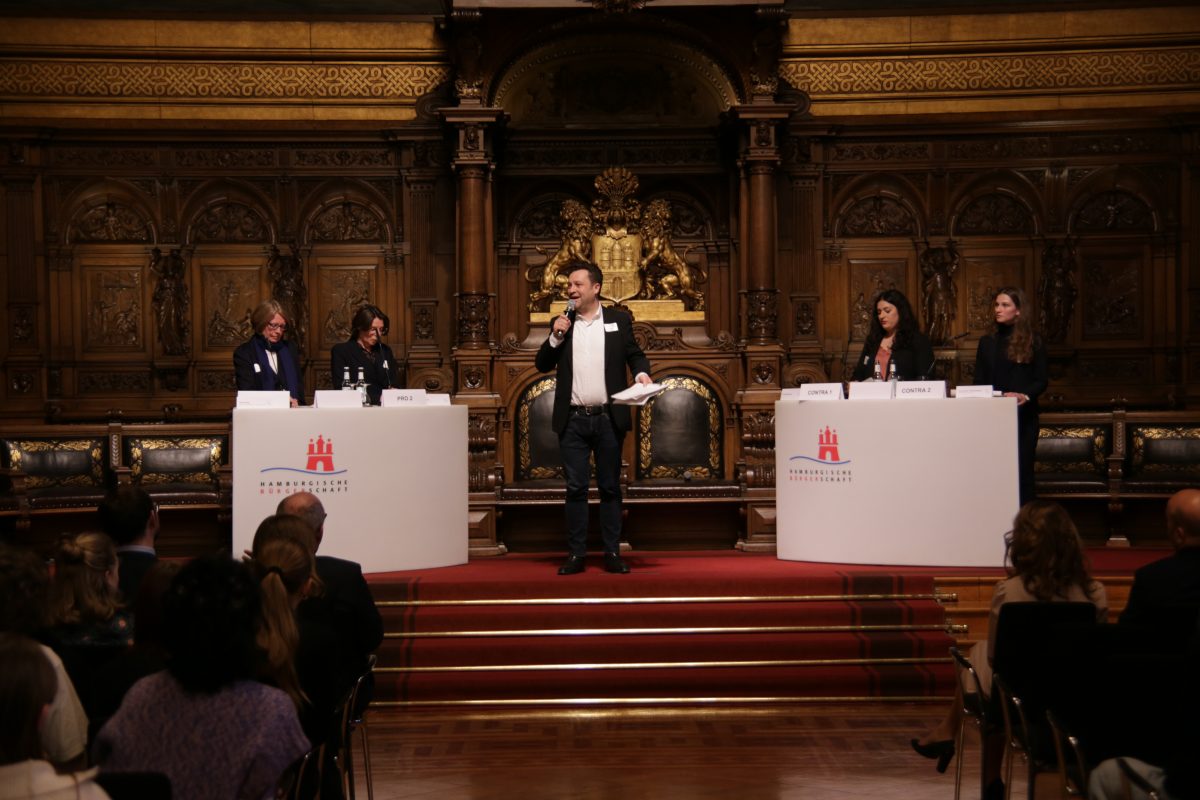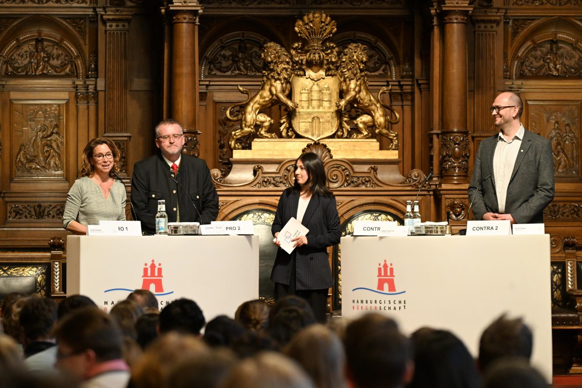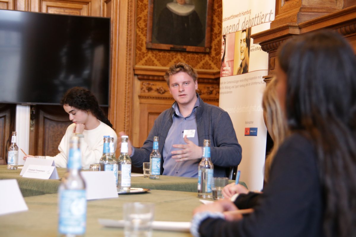 Carola Veit – Präsidentin der Hamburgischen Bürgerschaft, Thomas Bressau – Wettbewerbsreferent der BSFB, Dr. Jan-Jonathan Bock – Projektleiter von Jugend Debattiert, sowie Fraktionsvertreter:innen der Parteien der Bürgerschaft und unsere Medienpartner begleiteten den Landeswettbewerb als Juror:innen und Gäste der Talkrunde.