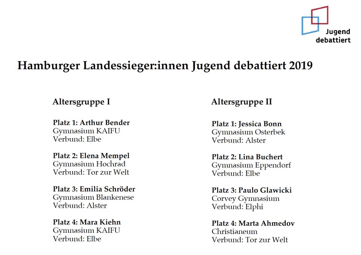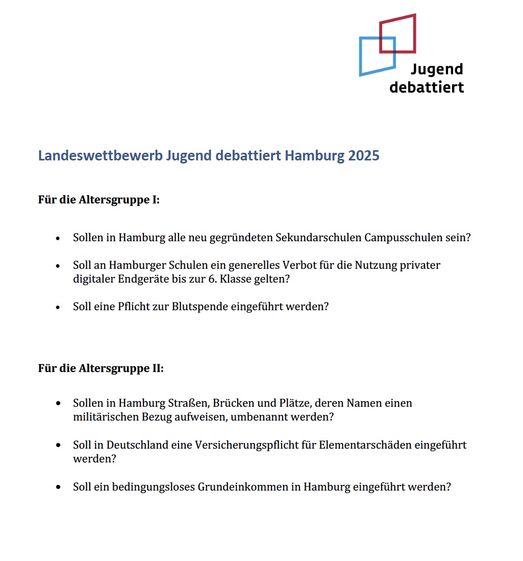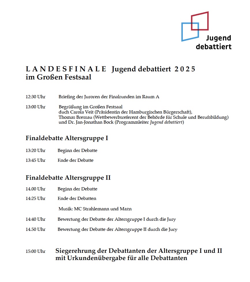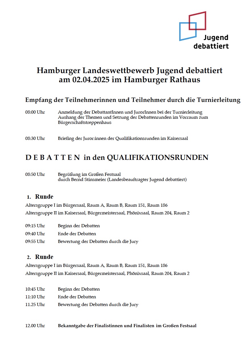 Nachdem rund 15.000 Schülerinnen und Schüler aus 82 Hamburger Schulen bei den Vorentscheiden zu „Jugend debattiert“ mitgemacht haben, traten die 40 besten von ihnen in den beiden Vorrunden des Landeswettbewerbs an.