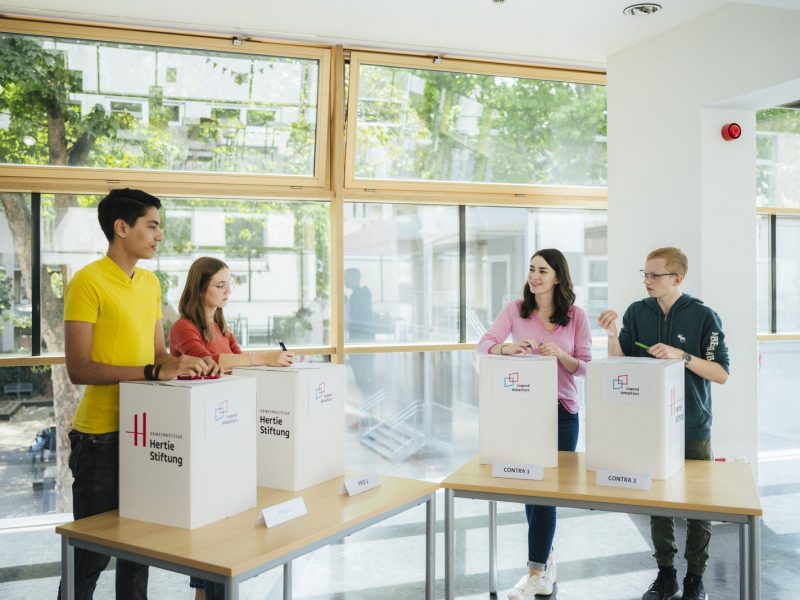 Für die Schüler:innen beginnt Jugend debattiert im Unterricht. Die fortgebildeten Lehrkräfte vermitteln die Grundlagen und üben mit ihren Klassen das Debattieren.